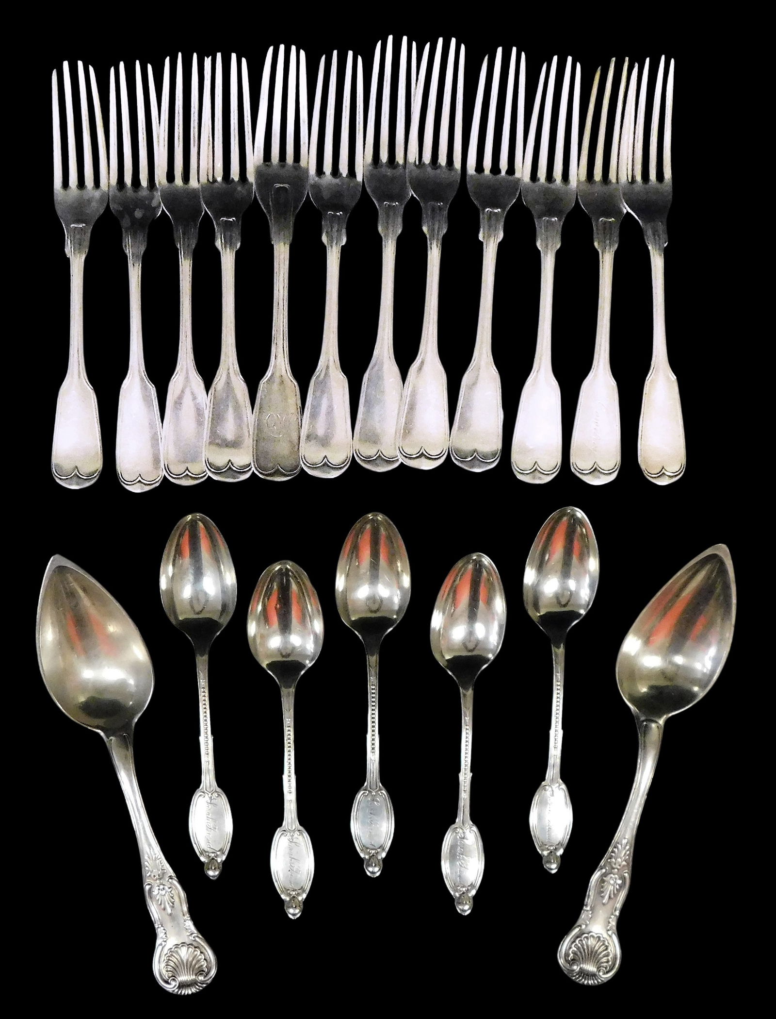 SILVER: Nineteen tested silver flatware pieces, including: two serving spoons, each 8" l.; twelve