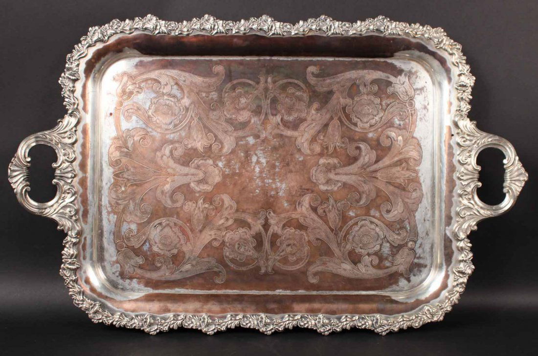 HEAVY SILVER PLATED TWO-HANDLE, SHAPED RECTANGULAR, FOOTED SERVING TRAY. - L: 22 1/4 in., betweenSloans & Kenyon4.3(87)$608 hrs Left