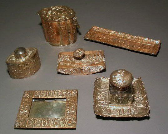 Lot of Silverplated Items39 mins LeftLot of Copper Items39 mins LeftLot Brass Desk Items39 mins LeftASSORTED COPPER ARTICLES, LOT OF SIX39 mins LeftHUGE LOT ANTIQUE & VINTAGE SILVER PLATED TABLEWARE3 days LeftASSORTED SILVER-PLATED AND OTHER ARTICLES, LOT OF SEVEN39 mins LeftLot of Silver AccessoriesMar 21, 2026MIXED LOT OF COPPER AND SILVER PILL POTS2 days LeftSterling Silver Estate Tablewares1 day Left5 Piece Tiffany Studios New York Gilt Bronze Desk Set in Zodiac circa 1900Mar 15, 2026TIFFANY STUDIOS Group of Fifteen Desk Set Items, circa 19151 day Left10 Metal, Pewter, & Other Jewelry & Trinket BoxesMar 17, 2026Nine Desk Pieces, 19th/20th c., Largest Inkwell- H.- 4 in., W.- 4 in., D.- 4 in. (9 Pcs.)Mar 27, 2026TIFFANY STUDIOS Nine-Piece 'Zodiac' Desk Set, circa 19151 day LeftGroup of Chinese Metal Table ArticlesMar 12, 2026TIFFANY STUDIOS Four-Piece 'Grapevine' Desk Set, circa 19151 day Left