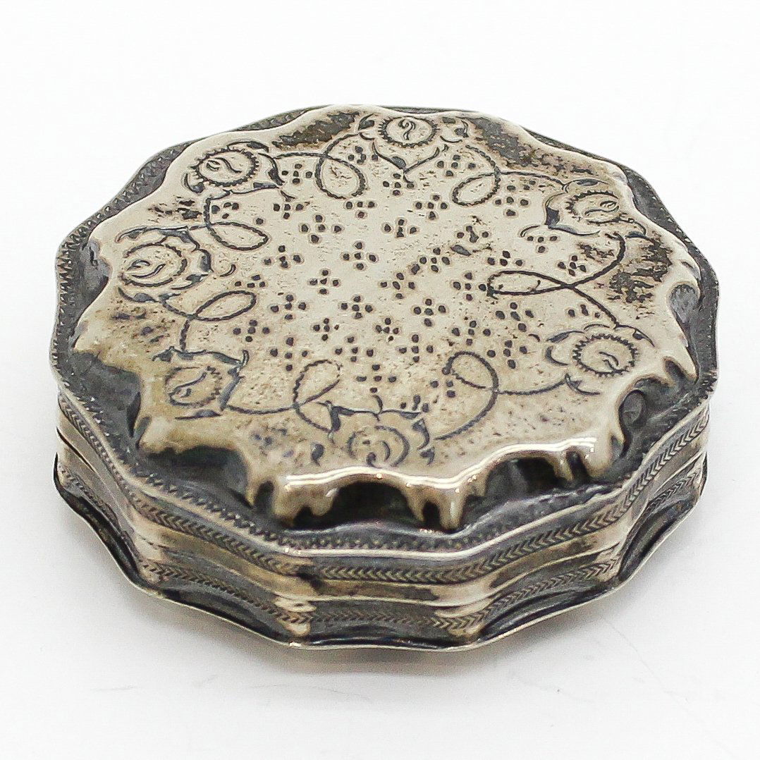 SoldAntique Dutch Coin Silver Pill or Peppermint BoxDutch trinket / pill / mint box. Impression depicts everyday life. Stamped 800 bottom. 2 1/4" W x 1 1/2" x 1" H. Excellent condition.See Sold Price
