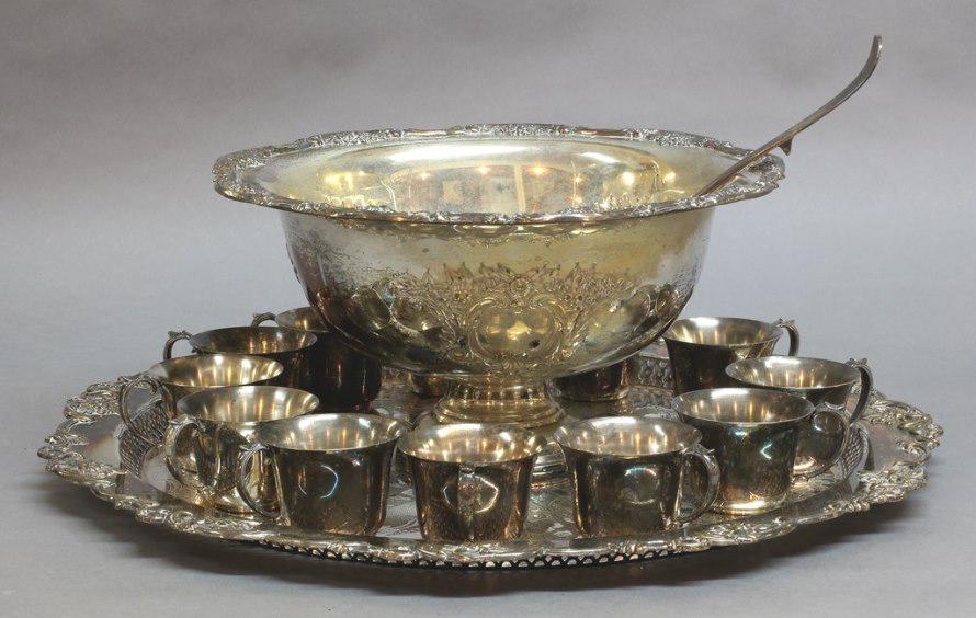 SoldSilver Plate Punch Bowl Set & Serving TraysSilver Plate Punch Bowl Set & Serving Trays. * Punch Bowl With 12 Cups And 1 Ladle. * Rectangle Serving Tray. * 2 Round Serving Trays. Photos Are Considered Part Of Description And Condition.See Sold Price