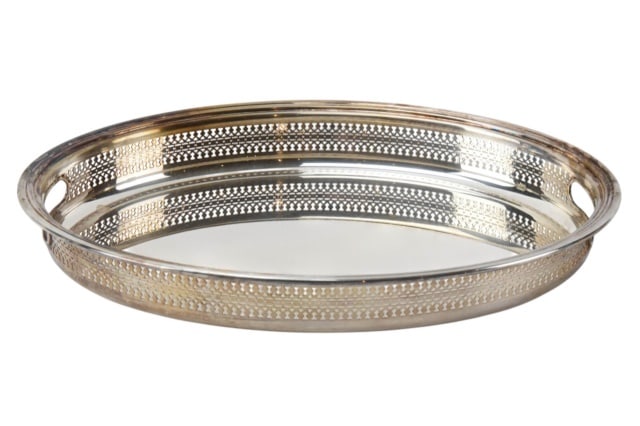 English Silver Plate Oval Serving TrayDESCRIPTION: An English large monogram silver plated gallery serving tray with pierced gallery. This large oval silver plated serving tray was made in England in the early-mid 20th century. It has a dSee Sold Price