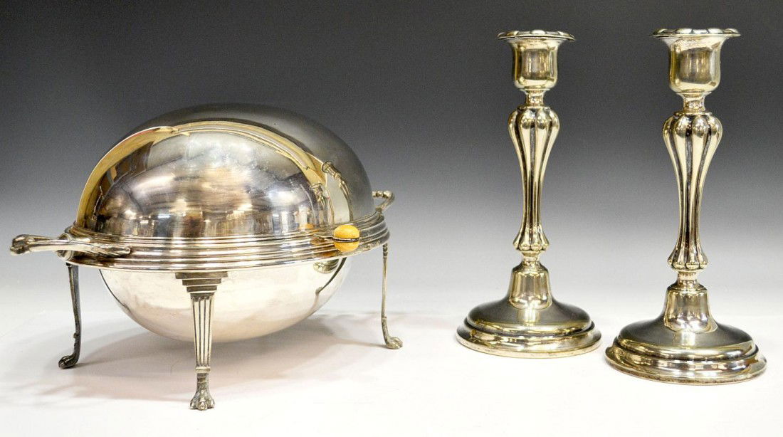 SILVER PLATE RUSSIAN CANDLESTICKS & DOMED DISH