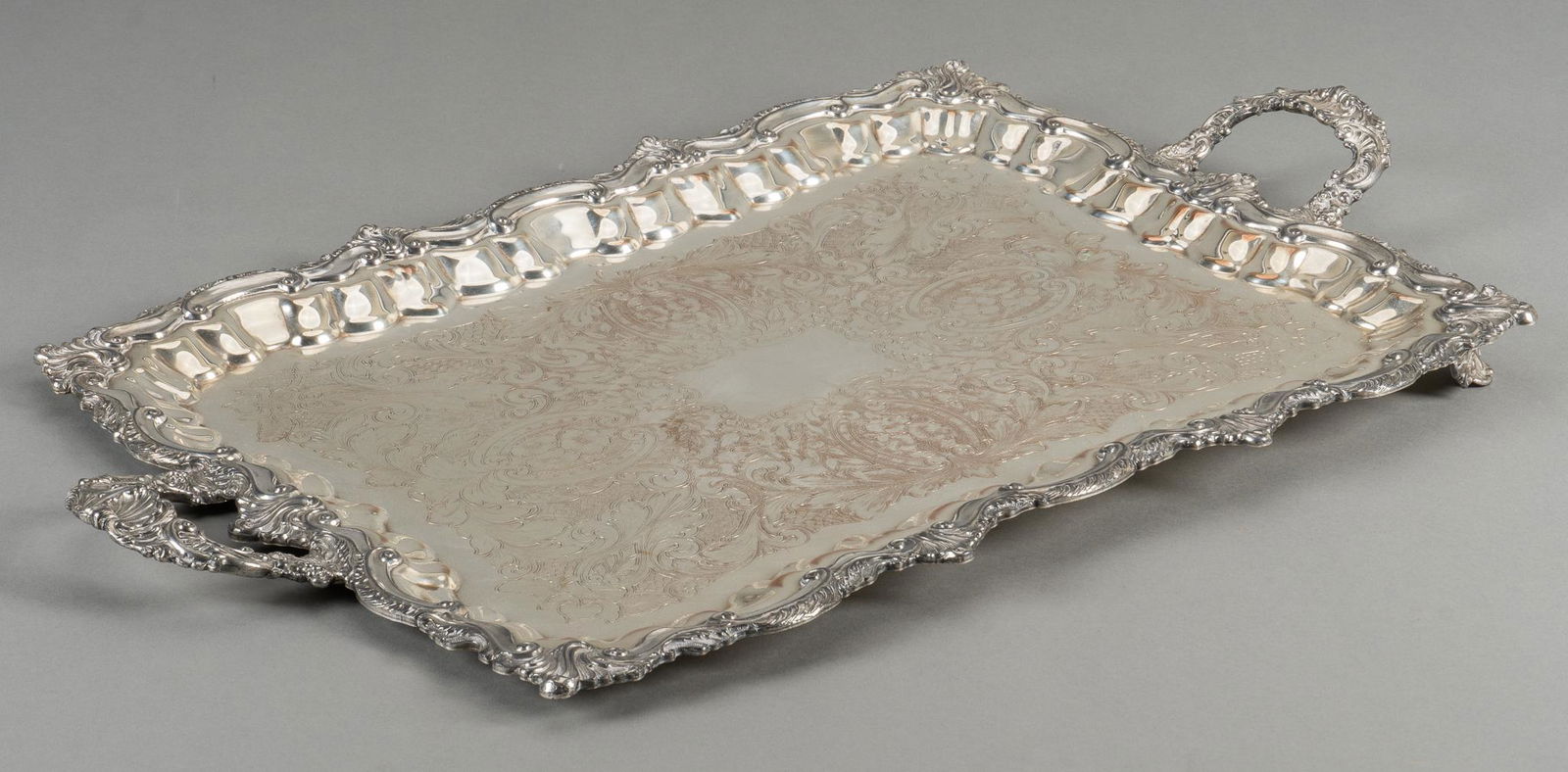 SoldVictorian Silver Plate Tray with Snake Form HandlesVictorian Silver Plate Tray with Snake Form Handles 20 x 30 in. The Collection of Jordan Saunders.See Sold Price