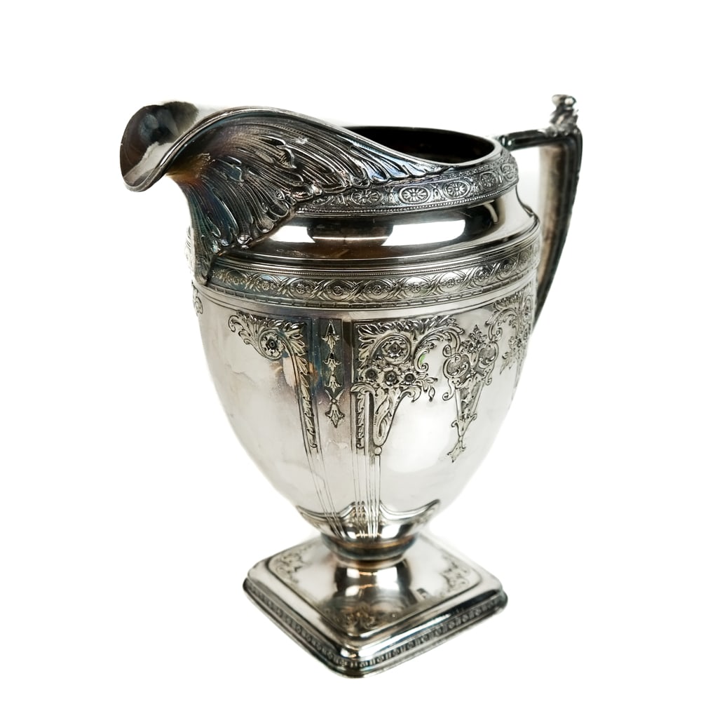 SoldVICTORIAN SILVER PLATE WATER PITCHER ON STAND. HEIGHTVICTORIAN SILVER PLATE WATER PITCHER ON STAND. HEIGHT 17"See Sold Price