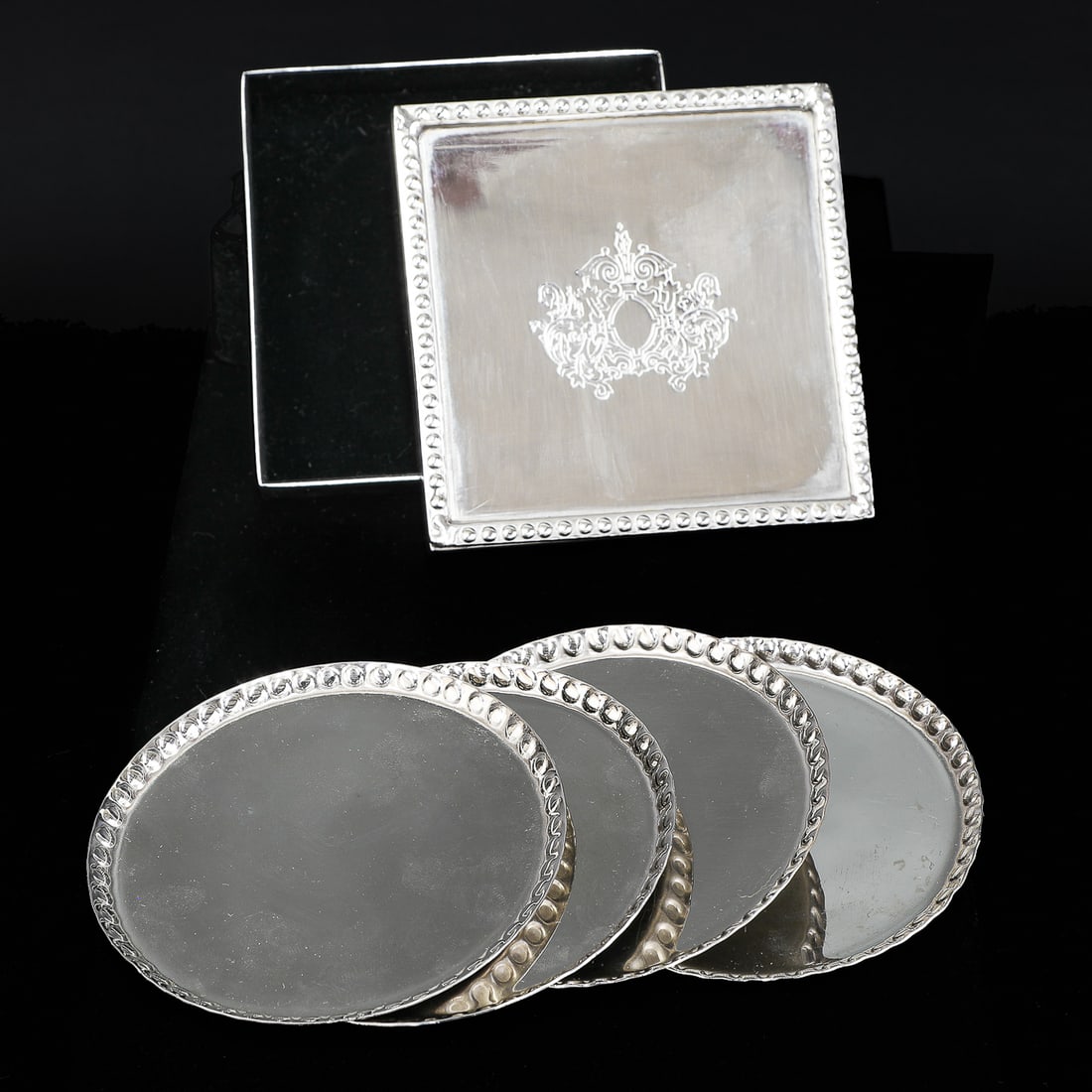 Silver Plated Square Box Housing Four Round Wine Coasters