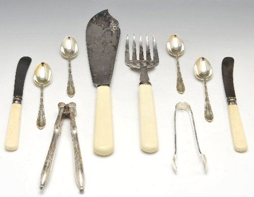 Silver teaspoons and sugar nips, nutcrackers, fish