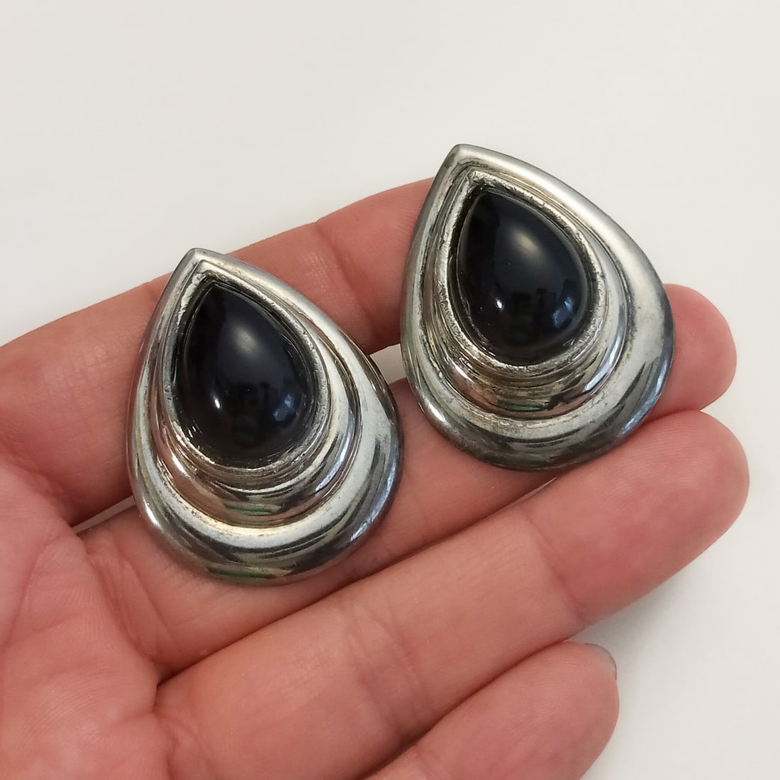 Silver tone black pear shape cabochon ear clips