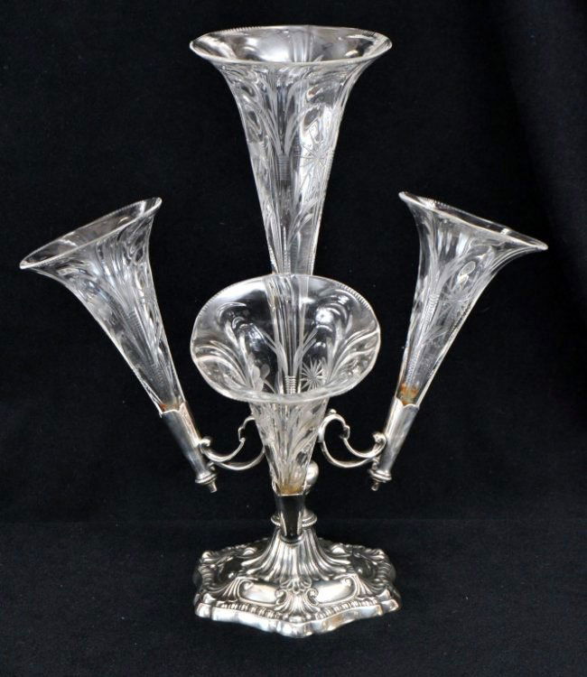 Sold4 Crystal Glass Epergne Vase Hallmark Silver Plate Base4 Crystal Glass Epergne Vase Hallmark Silver Plate Base. Vintage. Size: 9.5h x 10wSee Sold Price