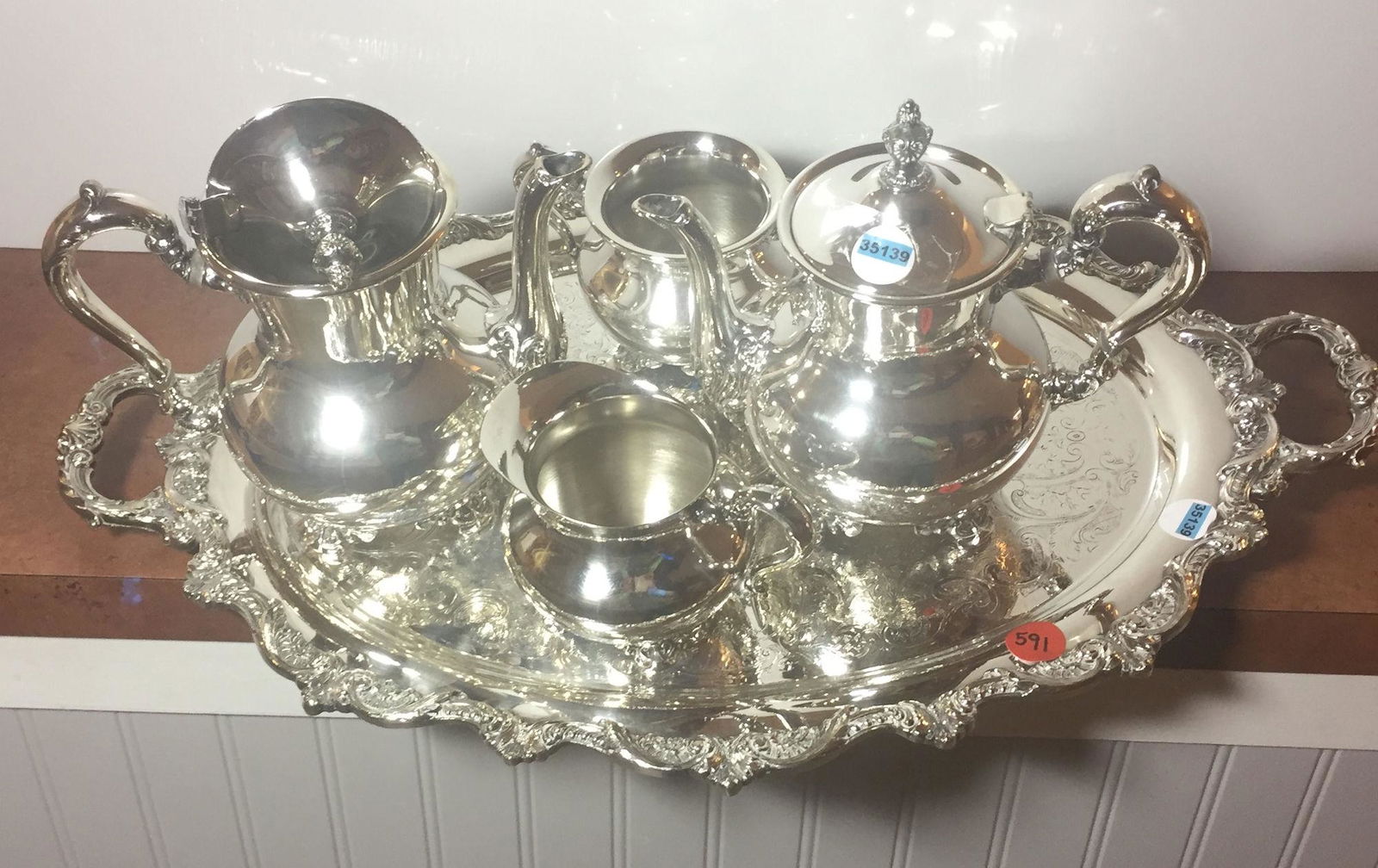 Silverplate LotApr 11, 2026Large estate lot of silverplate to include (4) trays, 2 pc. Tea set, flatware, pitcher, (3) coveredApr 10, 2026Misc Silver Plate LotApr 11, 2026(5 Pc) Silver Plated Reed & Barton Tray & Pairpoint Coffee Tea Service2 days LeftSilver Plate Two Handle Tray and Three Silver Plate Serving Pieces3 days LeftWallace Grande Baroque Silverplate Tea Set 4pc with Tray2 days LeftElegant 7 Piece Chippendale Silverplate Tea Set with Kettle and Tray13 hrs Left19th Century Silver Plated Tea Set2 days LeftSilverplate over Copper Tray - 5485Mar 30, 20268 pieces antique, etc. silverplate incl Sheffield plate- 22" tray largest; 12" round tray widest17 hrs LeftSILVERPLATE TEA AND COFFEE SERVICE1 hr LeftSeven Piece Silverplated Tea Service by F B RogersApr 06, 2026Towle “Grande” Silverplate Tea & Coffee Service with Tray – 4 Piece SetApr 03, 2026LARGE ANTIQUE SILVERPLATE TEA SERVICE & TRAY7 days LeftFour-Piece Hand Chased Sheffield Silverplate Tea & Coffee Service with TrayMar 22, 2026Vintage antique silver-plated tea and coffee service Set with large serving trayApr 09, 2026
