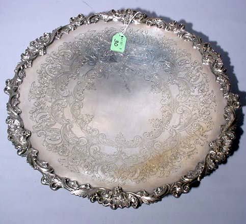 SILVERPLATED CIRCULAR FOOTED EMBOSSED SERVING TRAY