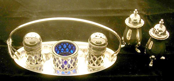 Silverplated condiment set with cobalt liners on