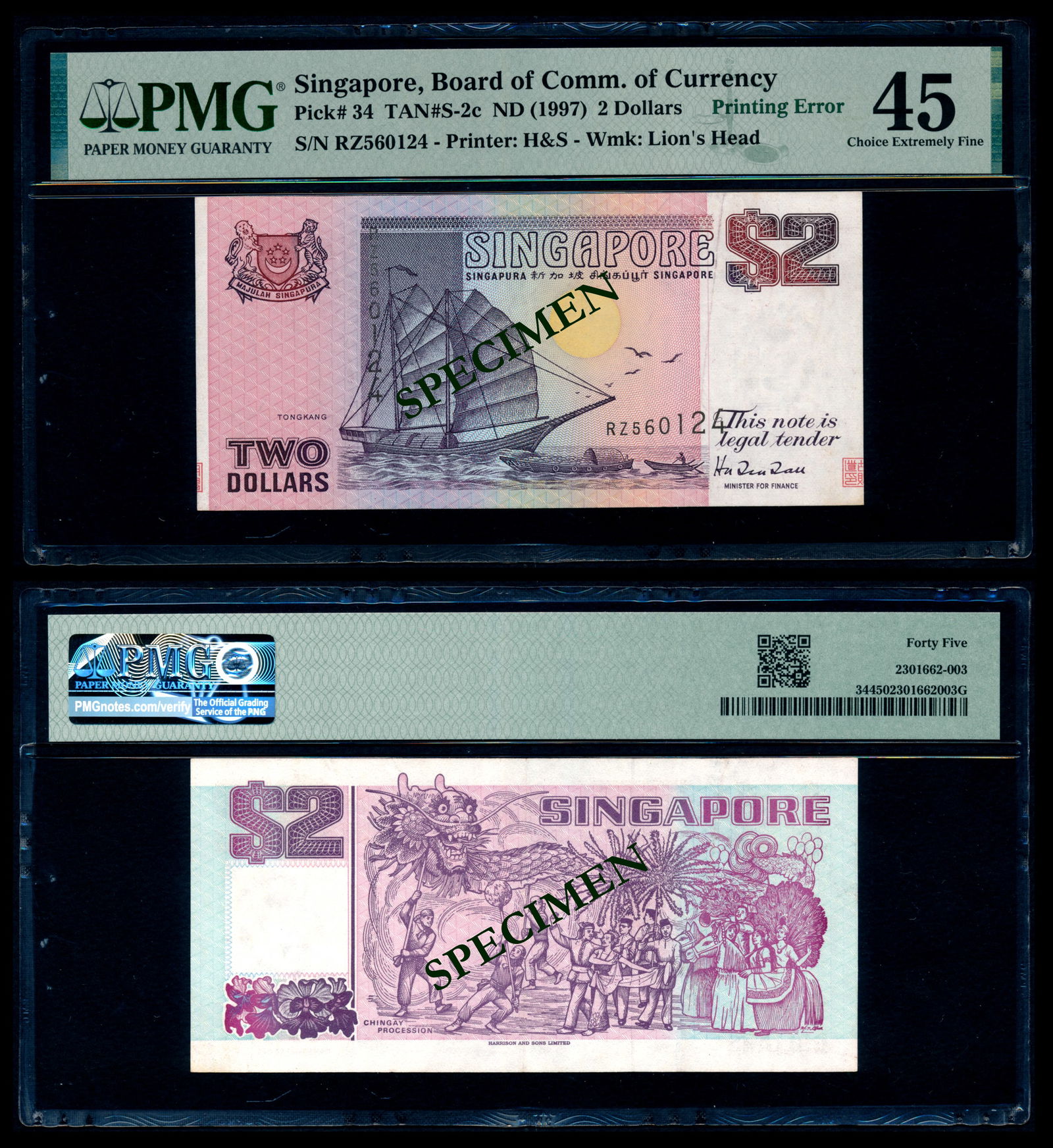 Singapore $2 1997 ship purple printing error