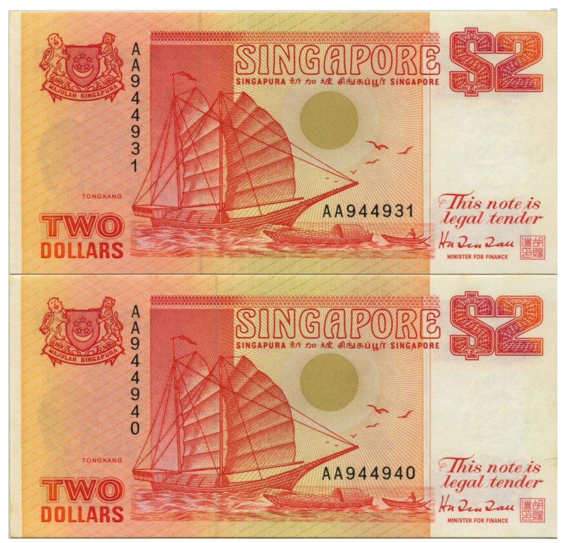 SINGAPORE Ship Series: $2 First Prefix consecutive