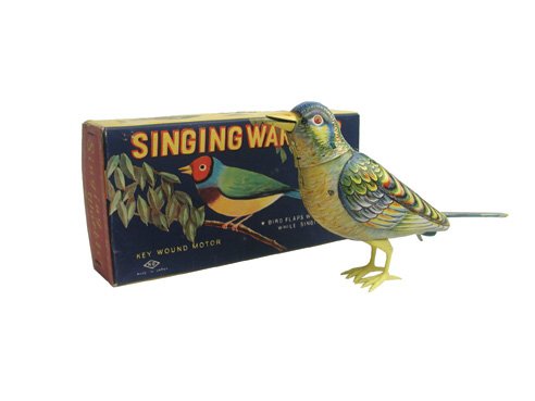 SoldJapan Singing WarblerJapan Singing Warbler, tin Litho, key wind mechanism, bird flaps wings while singing, circa 1950s, original illustrated box, 4" x 8 1/4" x 2". CONDITION: New cond., but over wound and not working.See Sold Price