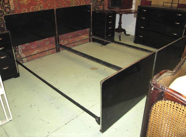 SINGLE BEDS, a pair, black lacquer and chrome, en suite