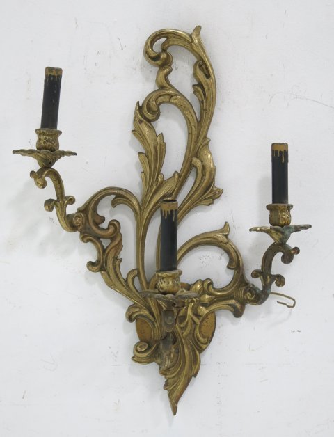 SoldGilt Bronze French Style Wall Sconce CandleholdersPair of early 20th century French Louis XV style home interior wall decor. Each modeled with 3 arms with floral decorations with 3 separate cup holders each for a single candle. No apparent markings.See Sold Price