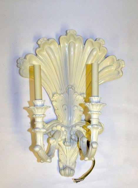 SoldSirmos Hollywood Regency Shell Wall SconcesDESCRIPTION: Vintage pair of Sirmos Hollywood Regency style wall sconces composed of cast resin with clam shell forms and white lacquered finishes. Each fitted with single bulb outlets. CIRCA: 1970s OSee Sold Price