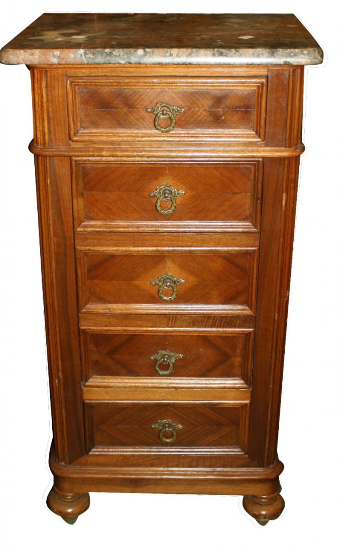 SoldLOUIS PHILIPPE WALNUT MARBLE TOP CHEVETLOUIS PHILIPPE WALNUT CHEVET WITH WHITE MARBLE TOP; 32"H X 17.25"W X 15"WSee Sold Price