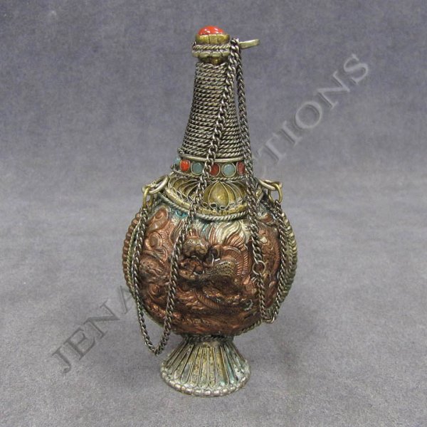 AN ANTIQUE TIBETAN MIXED METAL CORAL AND TURQUOISE INSET SNUFF BOTTLE. 9.5 cm x 6.5 cm.Hannam's Auctioneers Ltd4.3(416)£56 days Left