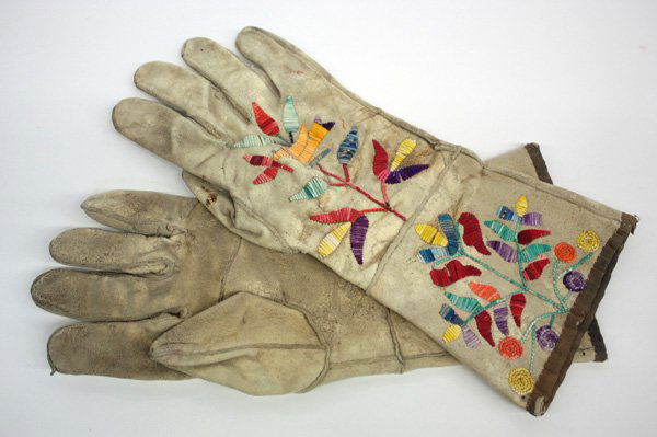SoldChippewa Embroidered Silk GlovesPair of Chippewa finely embroidered ladies gloves with fringe and fur trim. Very good condition with some damage to inside satin lining. Circa 1900. 14.5" x 9.5". CODE-CANSee Sold Price
