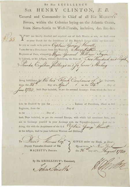 Sir Henry Clinton Document Signed. One Partly Pr
