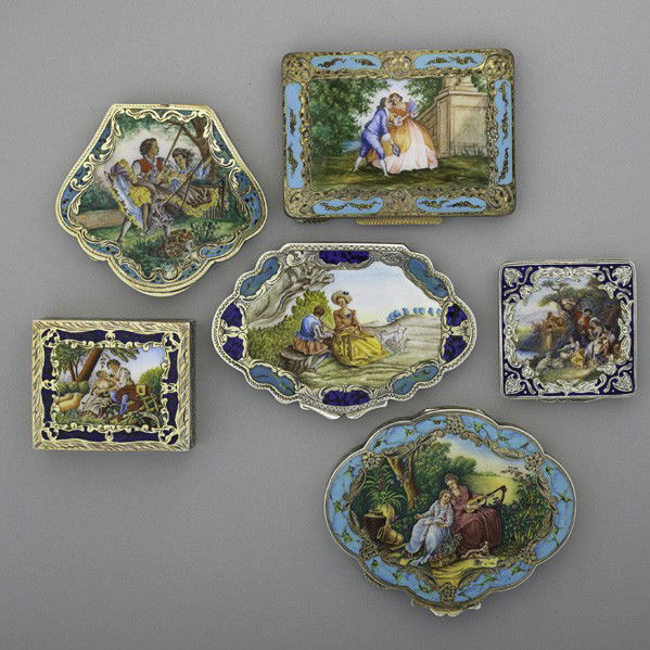 SIX CONTINENTAL ENAMELED SILVER COMPACTS