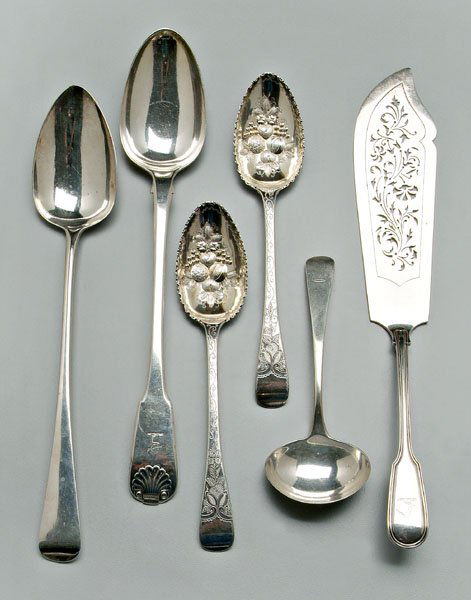 Six English silver serving pieces
