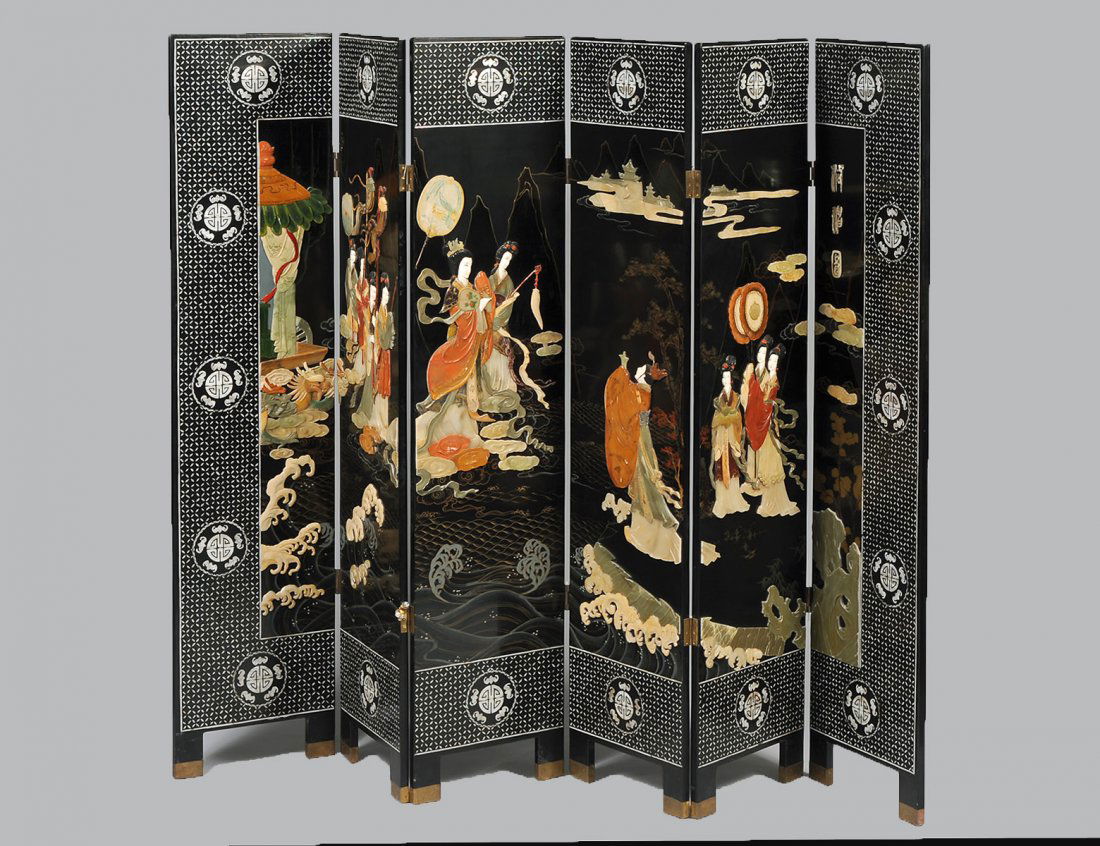 SIX FOLD SOAPSTONE OVERLAID LACQUERED SCREEN
