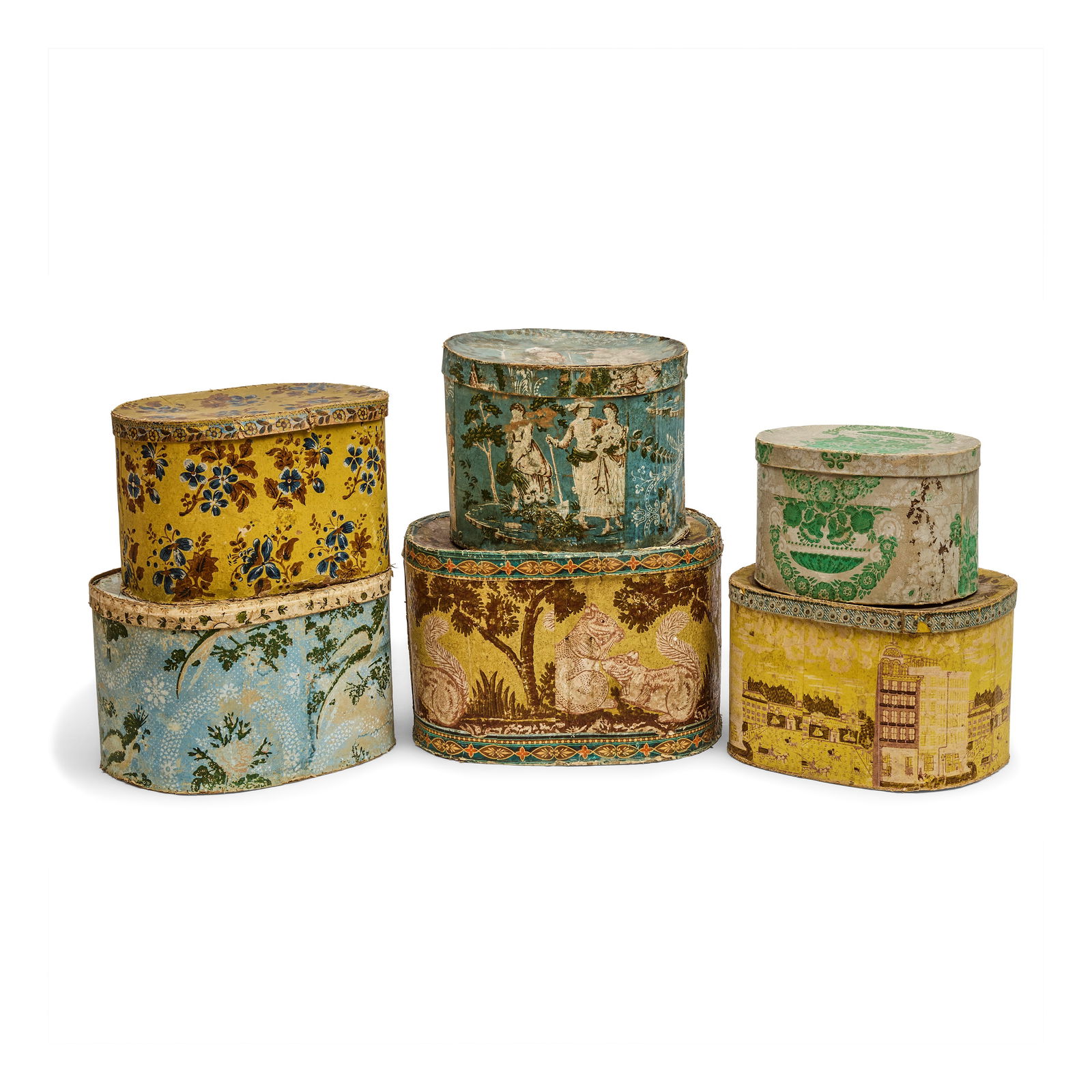 SIX HAND-STENCILED PAPER HAT BOXES19th century