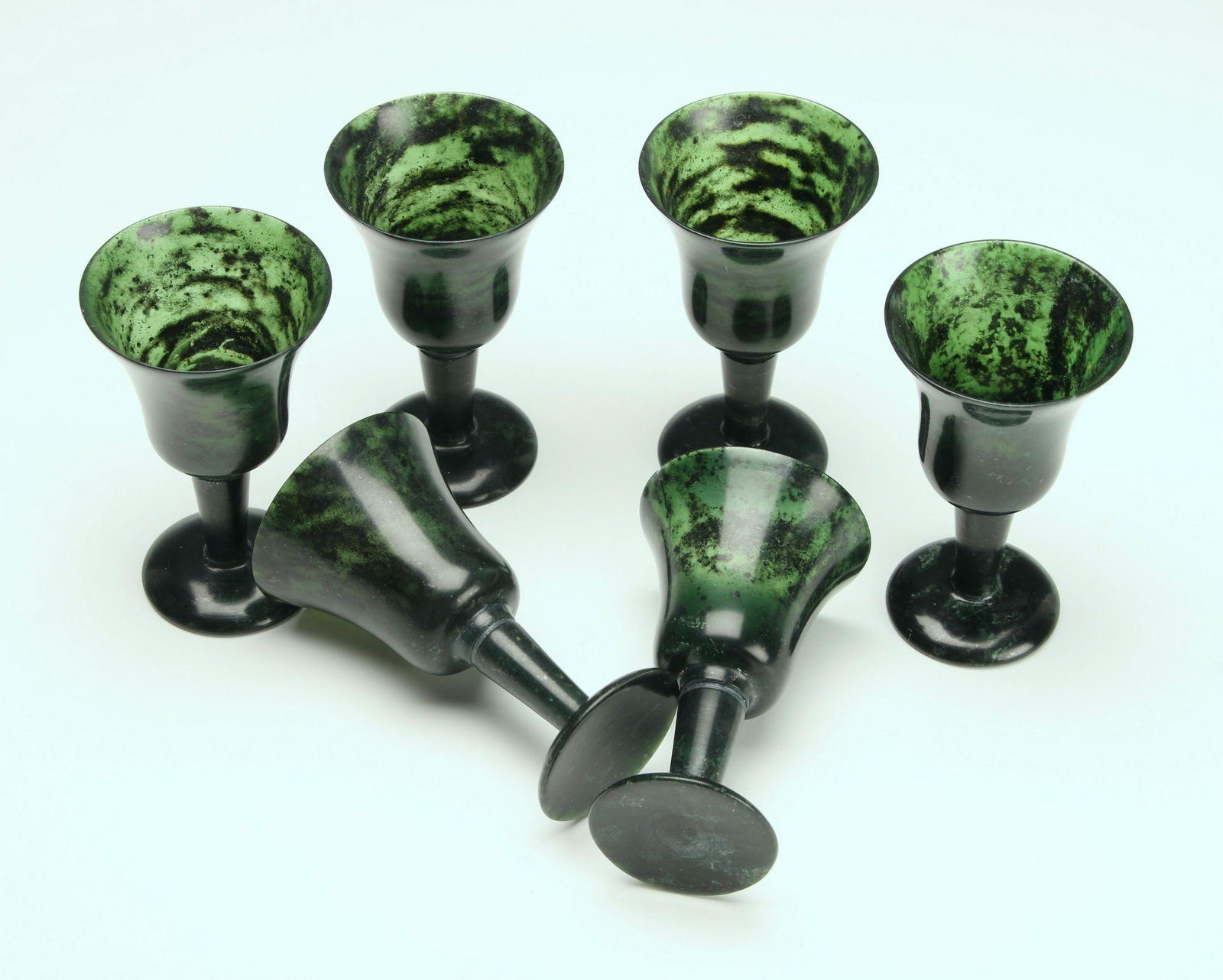 Chinese Spinach Green Jade Carved Goblets 3pc