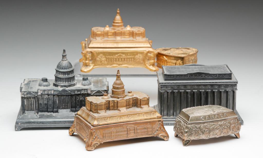 LOT ANTIQUE BRONZE BOXES, VANITY ITEMS, ETCMar 07, 2026Onyx, Porcelain & Enamel Trinket Boxes 4pc LOT7 days LeftVTG Box Assortment, Marble, Leather, Wood, 6pc LOT7 days LeftENAMEL LOT OF TRINKET BOXES PILLBOXES INCL. HEREND, LIMOGES, NEIMAN MARCUS2 days LeftBronze & Metal Works, Banthrico Financial Inst. Advertising Coin Banks Lot of 6Mar 16, 2026Kitschy Ornate Vintage Decor Assortment LotMeriden, Imperial Silver & Others Assorted 9pc LOT7 days Left(6) FABERGE STYLE JEWELED & ENAMELED EGG-FORM BOXES, 4 MUSIC BOXES3 days Left(4) CONTINENTAL SILVER MINIATURE FURNITURE & VIOLIN SHAPED BOXES3 days LeftVarious Items6 days LeftAn Assortment of Vintage Cast Iron and Metal Collectibles Including Huber and Enterprise7 days Left5 Metal Tobacco & Snuff BoxesMar 14, 2026A Collection of Art Nouveau Style Jewelry and Trinket BoxesMar 01, 2026Four Baroque style sterling silver vanity boxesMar 03, 20265 French Neoclassical Style Table Articles6 days LeftSilver Plate Lidded Boxes Plateau Tray and Brass Stamp Box (5)Mar 28, 2026