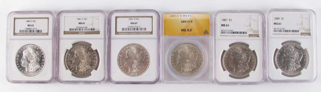 Sold6 GRADED MORGAN SILVER DOLLARSLot of 6 graded (NGC) and slabbed Morgan silver dollars including: Two 1884O (MS62 and MS63); 1883O (MS61); 1888O (VF35); 1894O (VG10); and 1921 (MS62). Coins will be onsite Monday Jan. 5 (too late foSee Sold Price