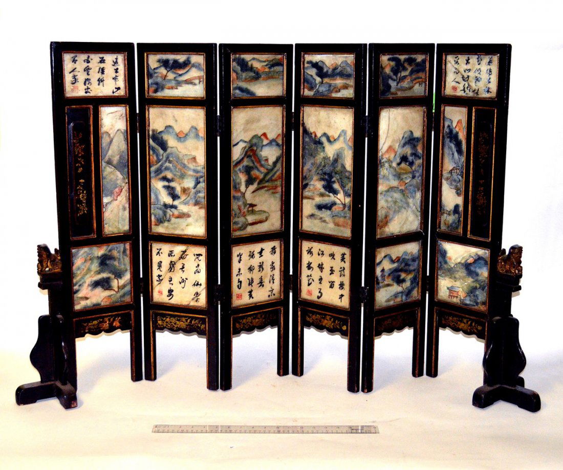 CHINESE LACQUERED COROMANDEL PANELS WITH BONE INLAYFeb 21, 2026CHINESE MINIATURE 6 PANEL PAINTED TABLE SCREEN19 hrs Left4 Chinese Lacquer Panels Soapstone Inlay Park2 days LeftA LARGE CHINESE BLUE AND WHITE PORCELAIN INLAID EIGHT PANEL SCREENFeb 15, 2026A QIANJIANGCAI PORCELAIN PLAQUE INLAID ANNATTO-WOOD TABLE SCREENMar 01, 2026A set of porcelain panel paintings of the four famous buildings of "Zhang Zhitang" of the EightFeb 28, 202696" Tall Vintage Oriental Lacquer ScreenJul 05, 2025Ten-Panel Korean Folding Screen of Calligraphy by Yun Yonggu (1852–1939)19 hrs LeftChinese Porcelain Birds & Pine Table ScreenFeb 15, 2026An exquisite zitanwood table screen with fish patternsMar 11, 2026Four Panel Black Lacquer Room Divider / ScreenMar 07, 2026Chinese Six Panel Tall Painted Floor ScreenFeb 19, 2026Vintage Chinese Soapstone Lacquered for Wall PanelsMar 07, 2026Chinese Natural Jade Folding Scholars Table Screen5 days LeftRosewood Folding Screen Four Seasons Flowers MotifFeb 22, 2026Late Qing to Republic Period Cantonese Embroidery Table Screen "Screen Opens to Wealth and Nobility"Feb 28, 2026