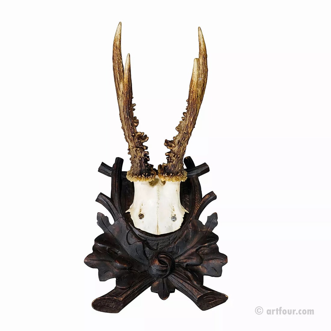 SoldBLACK FOREST ROE DEER TROPHY MOUNT C.1880sNicely matched pair of antlers on skull segment. Each with three points and measuring about 5 3/4", antler only. Original hand carved wood back mount, 9 1/4" height, in typical "Black Forest" motif ofSee Sold Price