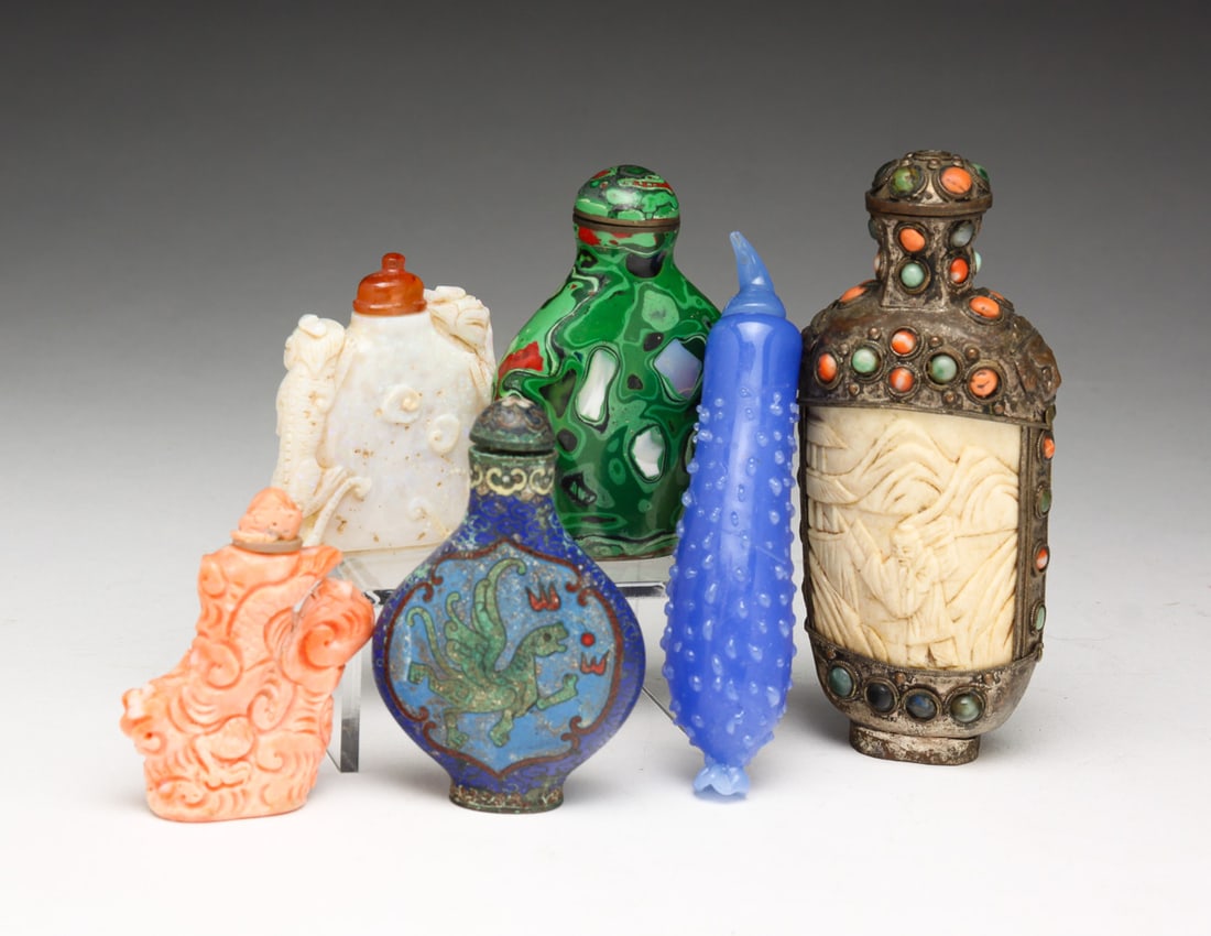 SoldGROUP OF SNUFF BOTTLESComprised of six snuff bottles with varying stoppers in different shapes and sizes. H:3in, 2 1/2in, 3 1/8in, 3 1/8in, 3in, 2 3/4inSee Sold Price