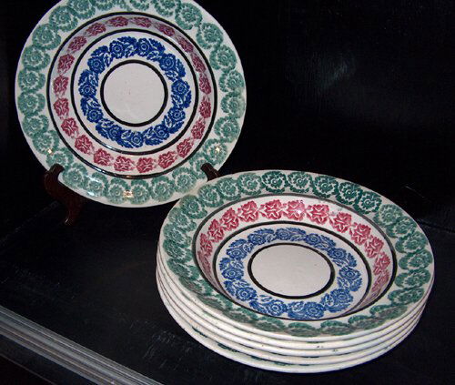 SIX SPONGE-DECORATED WHITEWARE SOUP PLATES Englan