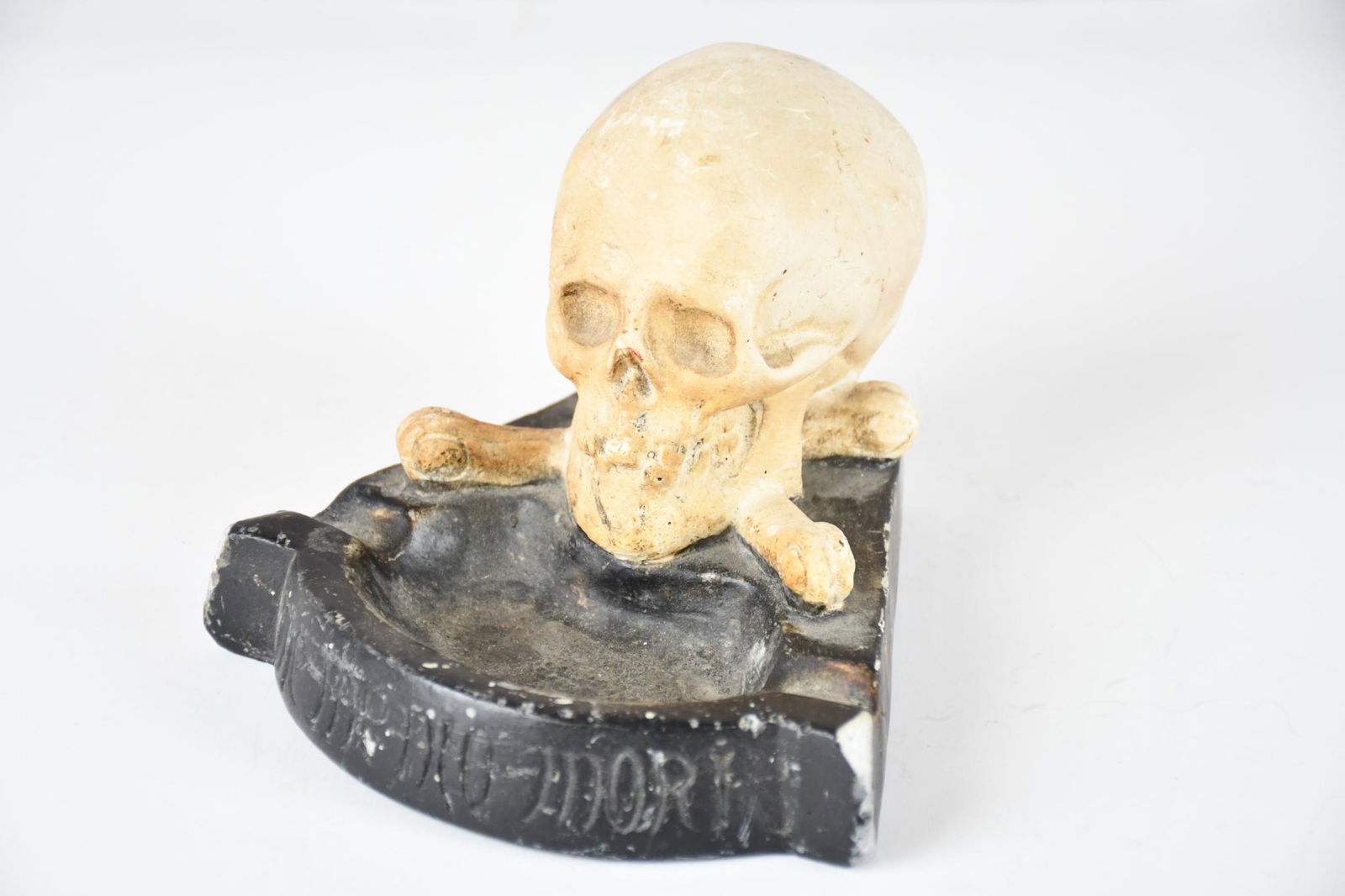 SoldSkull & Cross Bones Caulk Ware Ashtrayrated 7.5, 4"x6"x6", has wear and scratches, says "Me Menio Mori".See Sold Price