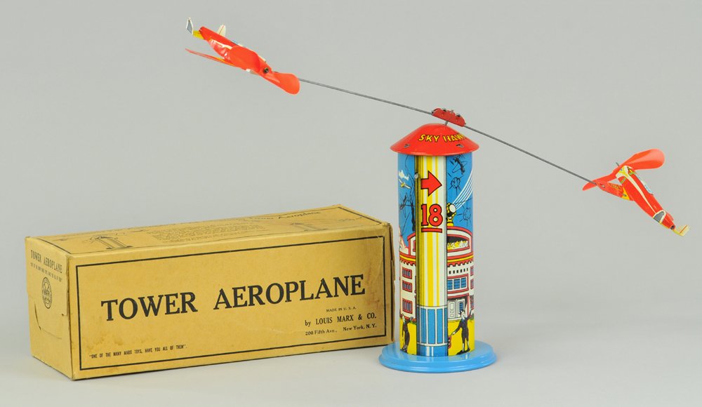 SoldSCARCE VERSION MARX SKY HAWK POPEYE AIRPLANE TOWER TOY.Comes in original box with black stenciling on sides, marked "Tower Aeroplane", complete with all flaps. Toy has two tin litho airplanes with celluloid props that fly around tower when wound. Tower isSee Sold Price