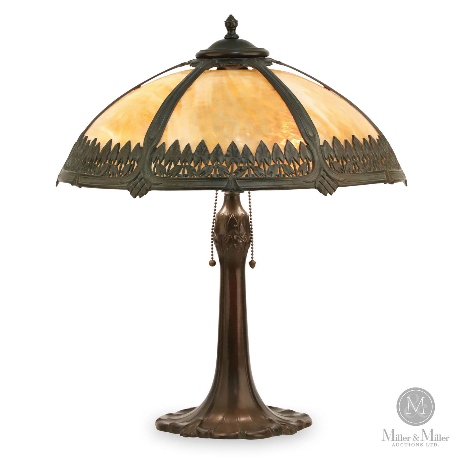 SoldArt Nouveau Slag Glass Bent Panel Table LampEarly 20th century bent panel two toned glass shade with ornate overlay throughout and seated on Art Nouveau bronze base stamped Miller Lamp Co as shown on bottom. Light signs of use and wear to speltSee Sold Price