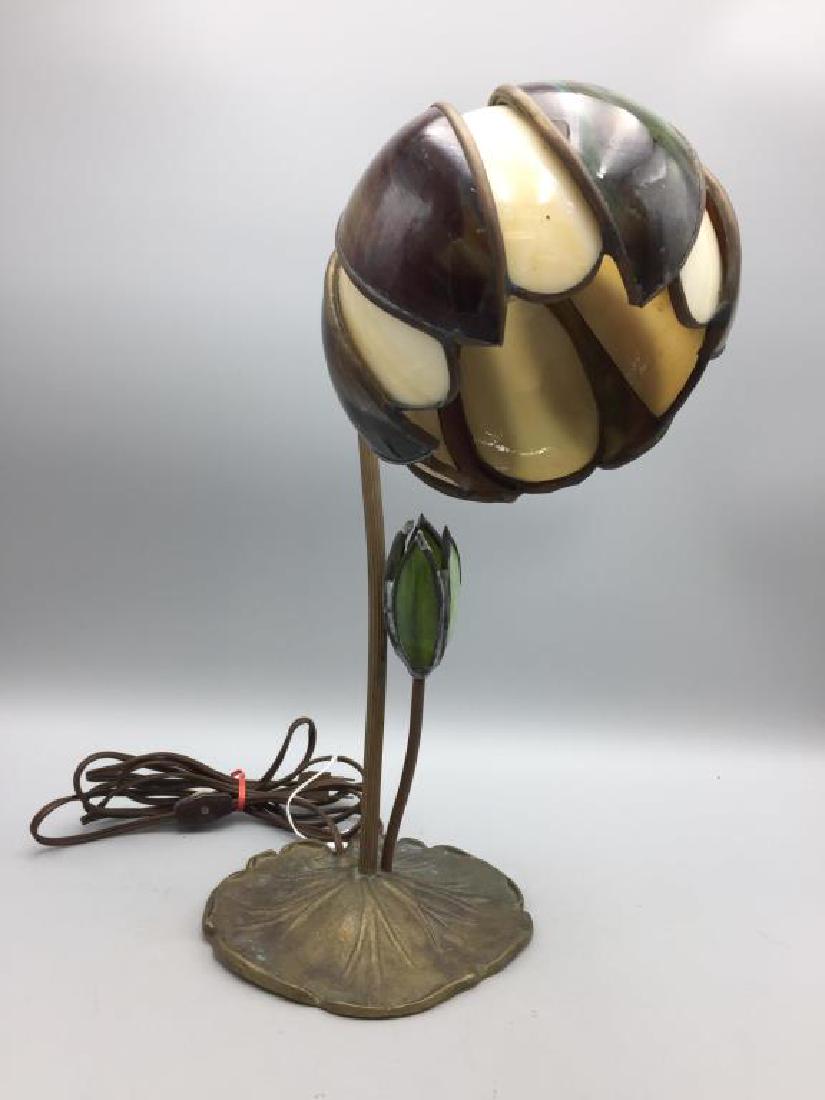 ANTIQUE SLAG GLASS TABLE LAMP W/ METAL OVERLAY