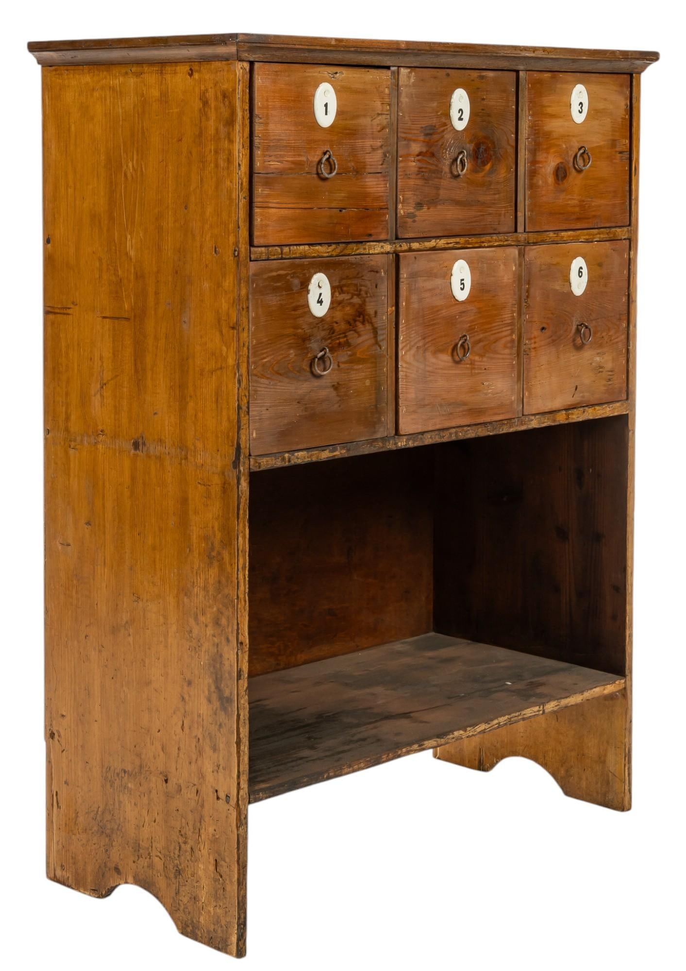 SoldPine Country Store Apothecary Cabinet 19th century. The19th century. The pine cabinet fitted with three rows of five small drawers and two longer drawers. The square drawers have turned wooden pulls the lower drawers have porcelain pulls. 36 inches heightSee Sold Price
