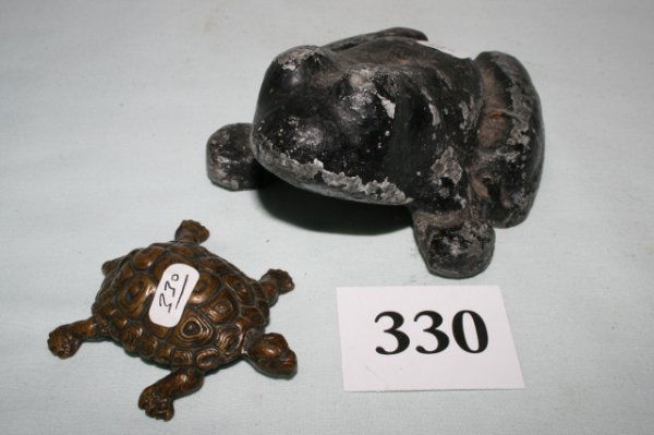 Small brass turtle and a cast iron frog