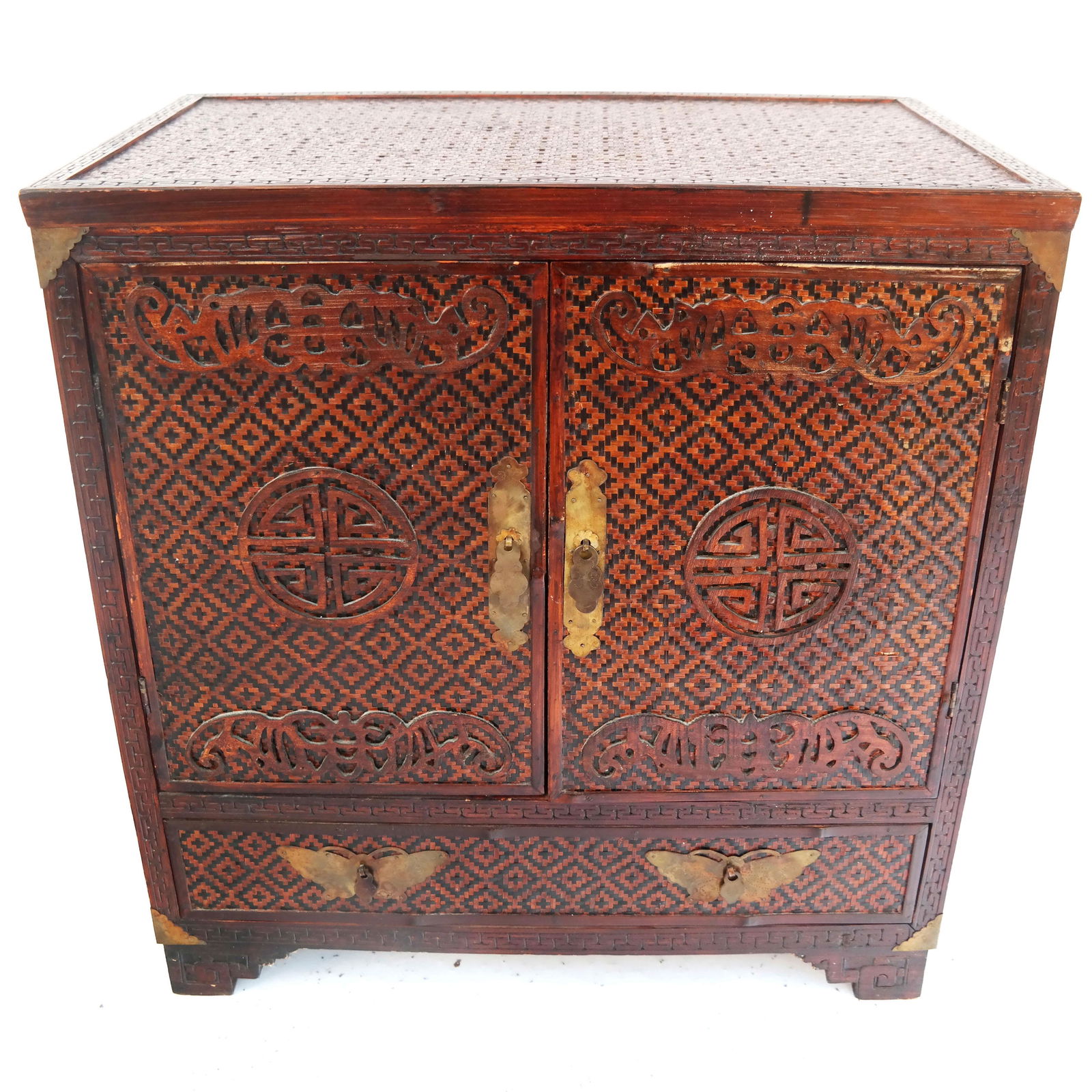 SoldSmall Chinese CabinetSmall Chinese cabinet with woven panels and carved details. [23 1/2" H x 22 1/2" W x 14 1/4" D]. Minor wear and losses.See Sold Price