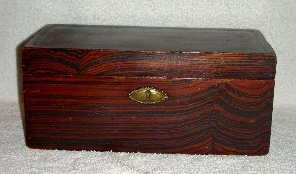 SoldAMERICAN / NEW ENGLAND FAUX-TIGER MAPLE PAINTED DOCUMENT BOXdome-top; 7.5"h; 18"w; 9"d NOTE: We cannot approve bidders during the auction. Please register as soon as possible.See Sold Price