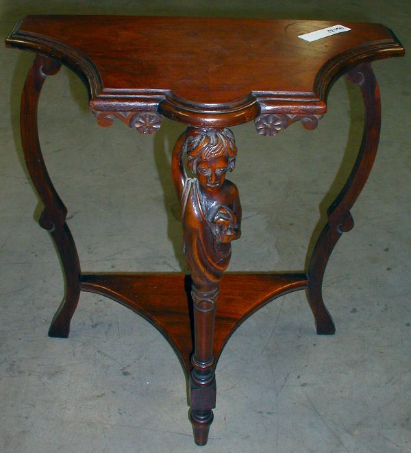 Sold1900'S FIGURAL CARVED CONSOLE TABLEFULL FIGURE CARVING, TRIANGLE CONSOLE TABLE. GOOD CONDITION. 26 1/2" W x 14" D x 24" H. THIS ITEM EXCEEDS SIZE LIMITATIONS FOR IN HOUSE SHIPPING.See Sold Price