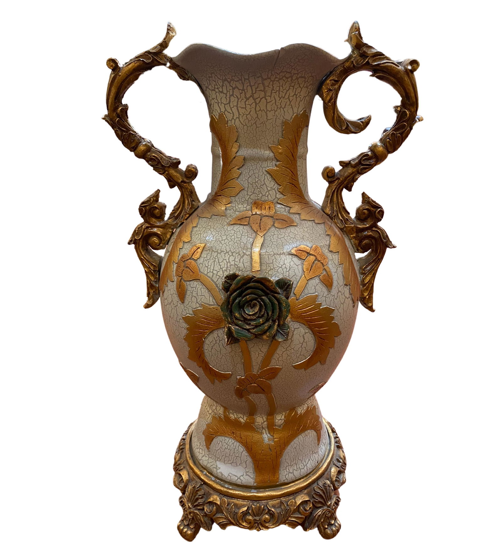 SoldPAIR OF METAL MOUNTED PORCELAIN URNSPAIR OF METAL MOUNTED PORCELAIN URNS: Pair of beautiful decorative crackle glazed porcelain vases with bronze handles & feet. Overall scrolling Acanthus motif. Approx. 22.5" h x 13.25" h x 9" w.See Sold Price