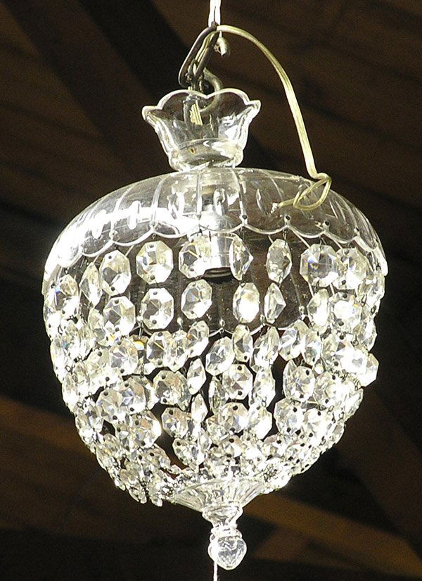 SoldSmall Crystal Dome & Crystals ChandelierChandelier w/chain approx. 29" high, light fixture only approx. 12" high. As found.See Sold Price