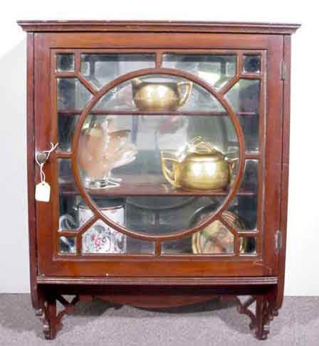 SMALL MAHOGANY SINGLE-DOOR WALL MOUNTED THREE-SHE