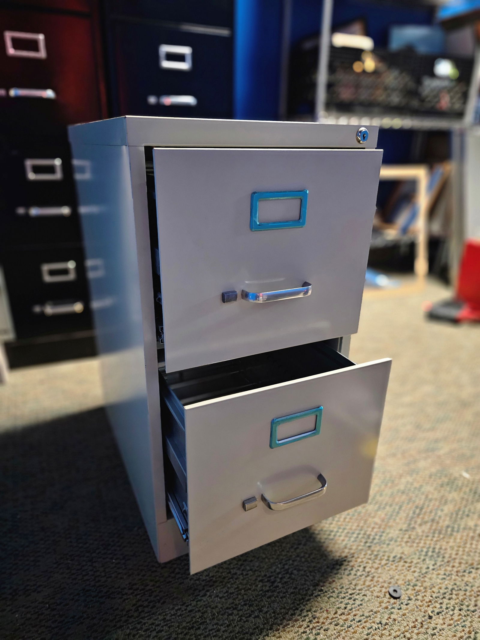 Sold2 Industrial Metal File Cabinets, Green.The lot contains 2 filing cabinets in distinct green tones. First, there is a dark green cabinet with 2 full size filing drawers, and a top drawer fitted to organize 2 rows of index cards. It measuresSee Sold Price